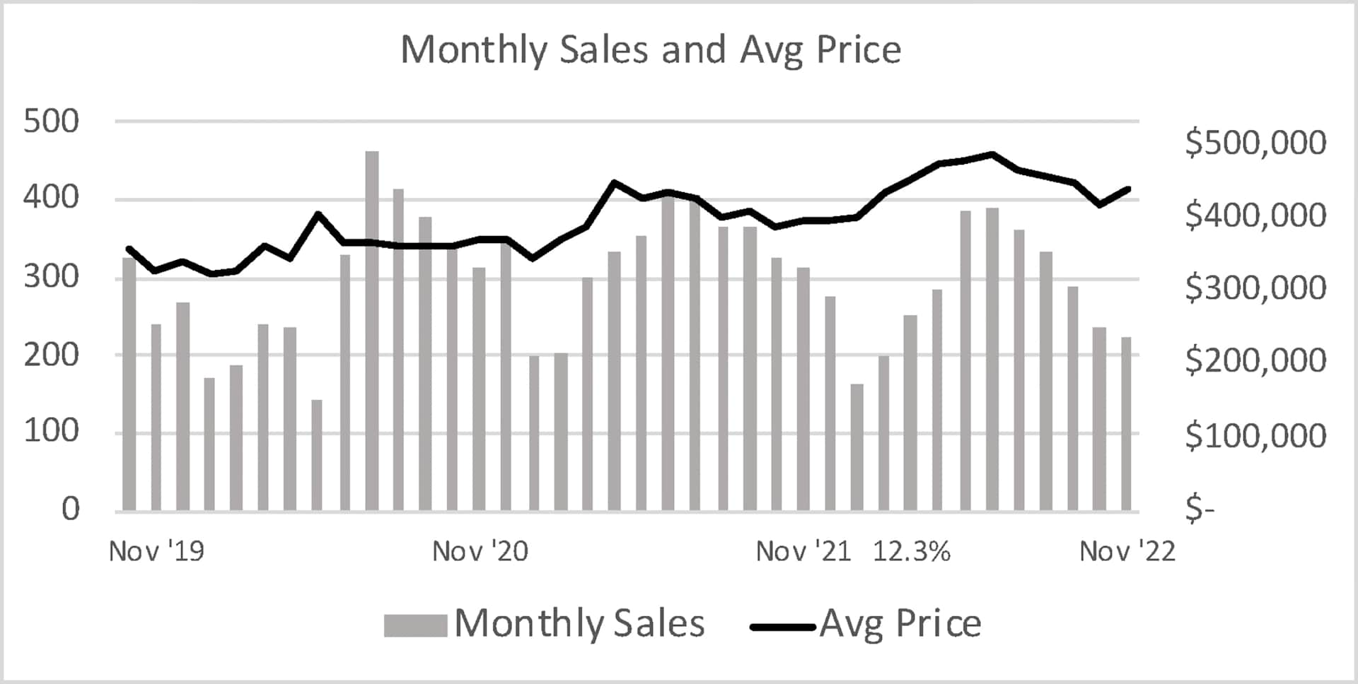 Since June’s market peak, this year’s challenges of higher interest rates, higher housing prices, non-housing inflation, combined with the post-pandemic easing of extreme demand has caused sales and prices to settle faster than they normally would. Despite current challenges, continued strong demand (especially for prime move-in-ready homes) has kept November’s average sale price of $439k 10% higher than the same month last year.